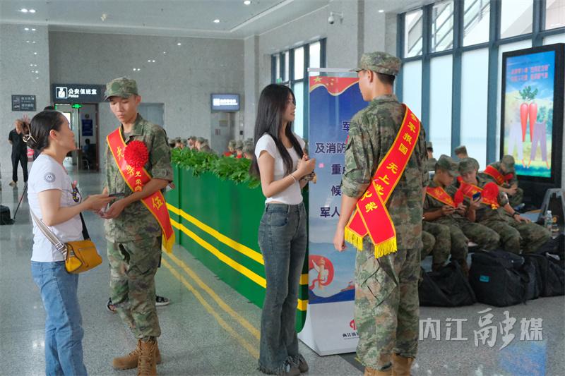 在内江北站候车大厅,新兵的家人和朋友们纷纷前来送行。他们有的手捧鲜花,有的挥舞着国旗,用自己的方式表达着对新兵们的支持和祝福。一位新兵的母亲说:“虽然舍不得孩子离开家,但我知道这是他自己的选择,也是他的梦想。我希望他在军营里能够好好照顾自己,努力训练,成为一名优秀的军人。”