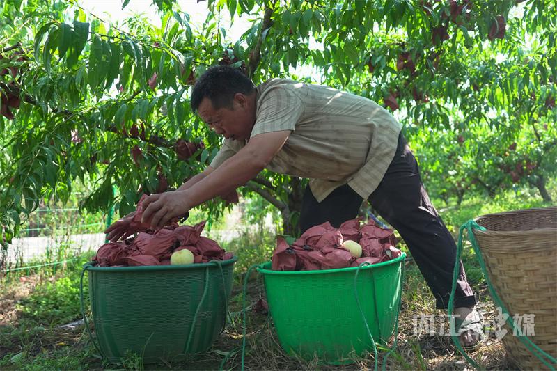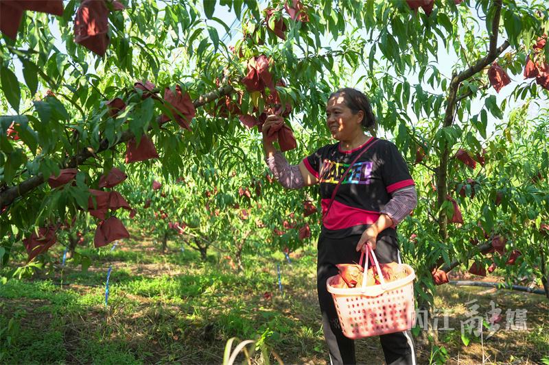 院坝里,工人们按照订单将蜜桃装袋、装箱。果园里,蜜桃挂满枝头,正散发着诱人的果香,等待更多的来客。