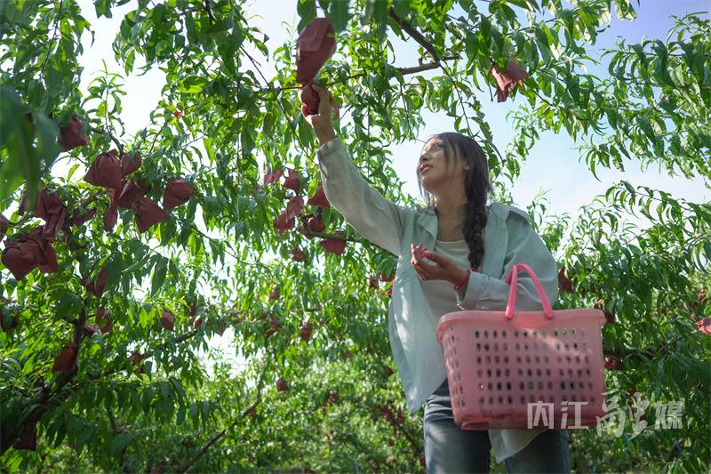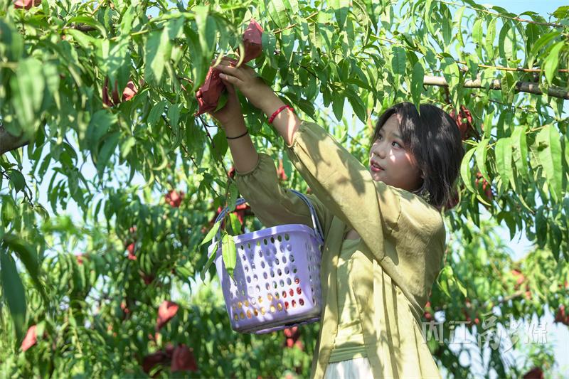 “今天专门从内江过来采摘,我最喜欢吃的水果就是桃子,这种桃子秋天才成熟,填补了我味蕾的空白!”游客吕星星手提果篮穿梭在桃林间,开心地挑选着蜜桃。