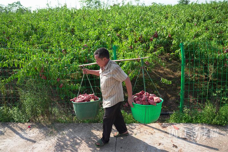如她一般,桃树下的游客们一边寻觅着,一边品尝着,果园里洋溢着阵阵欢笑,与此同时,果农们背着背篓、提着果篮,加紧采收蜜桃供应市场。