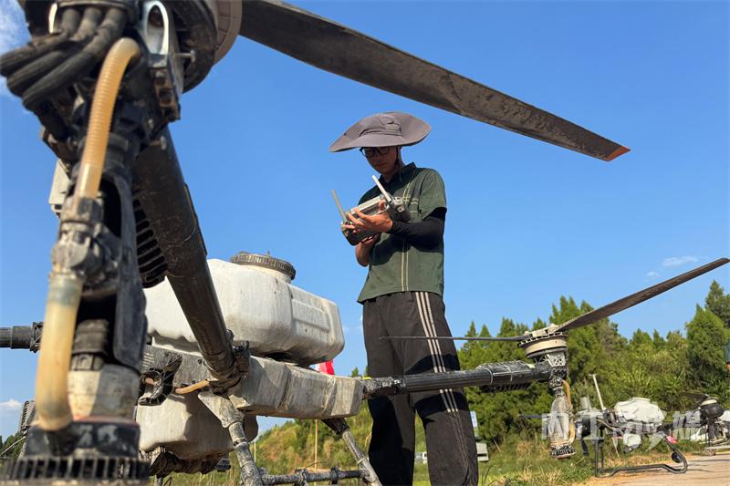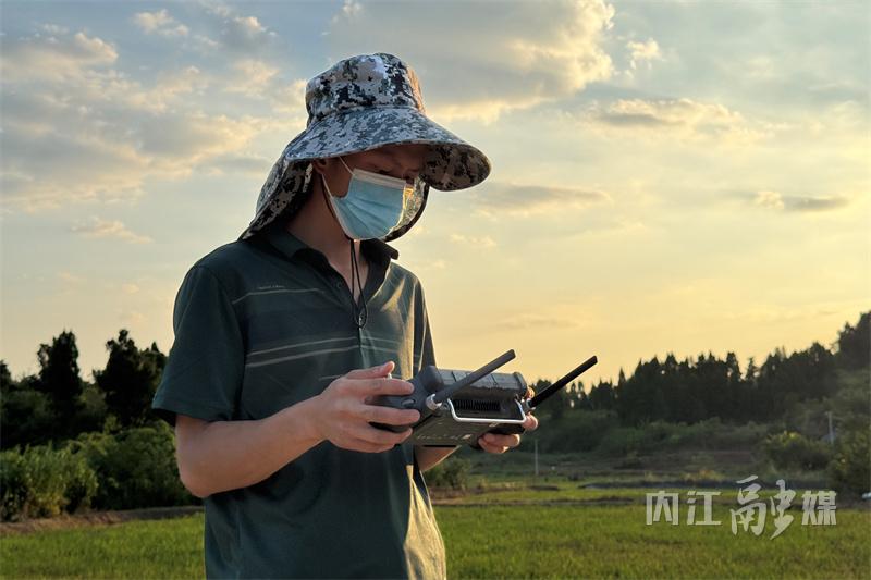 9月19日,内江市东兴区石子镇七星村,农技员操作无人机对再生稻进行病虫害统防统治。