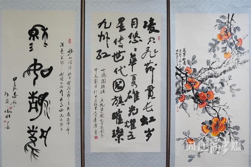 活动现场,近百幅书法、绘画作品整齐排列、琳琅满目,令人赏心悦目。其中既有书画家专门为祖国75周年华诞创作的作品,也不乏书画爱好者的爱国题材作品,还有来自中小学生的创意作品,它们共同绘就了一幅爱国爱党的壮丽画卷。作品前,大家踊跃翻拍、交流作品,营造了浓厚的文艺过节的气氛。
