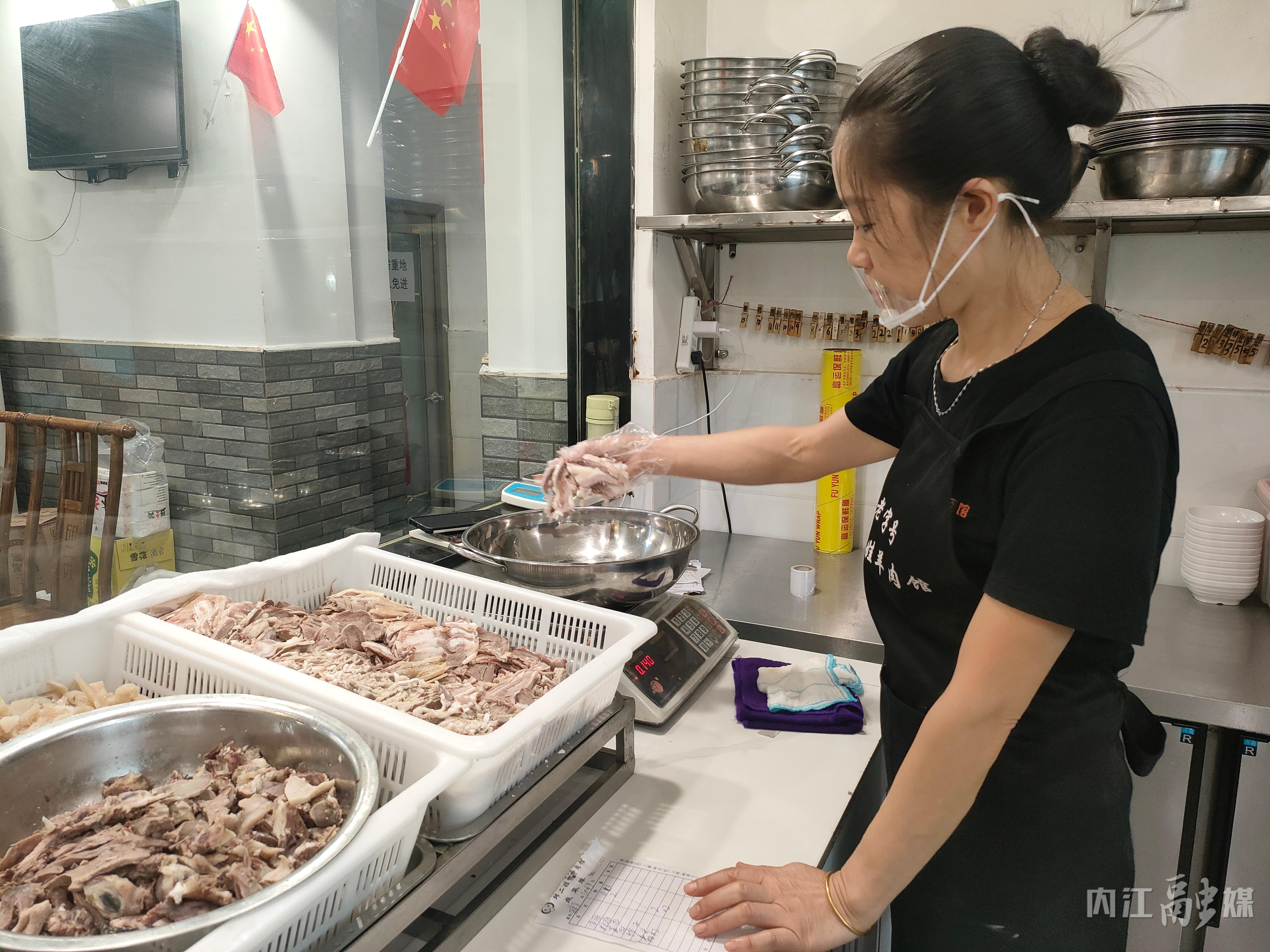 “欢迎光临,请问几位用餐呢?”老板娘邱二嫂热情迎接每一位客人,并细心地为他们安排座位。厨房里,工作人员忙着给切好的羊肉称重、煮汤、炒菜、上菜……每一个环节都井然有序。