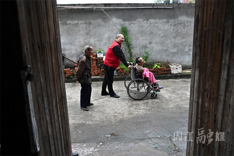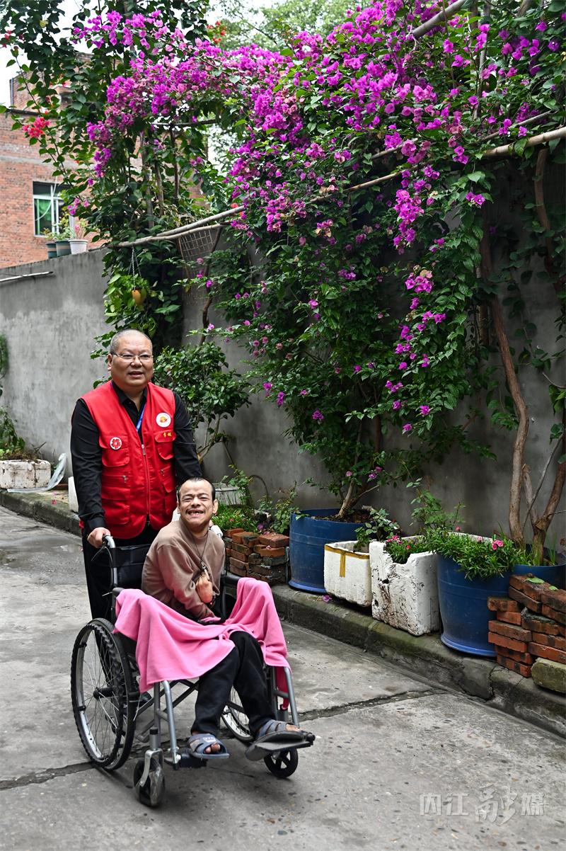 洗衣机安装好后,志愿者们推着张波出门散步,很久没有出过门的张波看着院墙上开得十分繁茂的三角梅,笑得很开心……