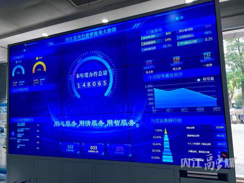 本年度办件总量、服务事项数、承诺提速率、平均跑动次数……11月6日,在东兴区政务服务中心一楼大厅,一块数字化电子显示屏实时显示着当前各种办理数据,让前来办事的市民心里有了底。