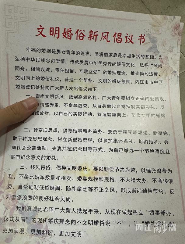 “根据市文明办发出的新倡议,我们组建了一支由网格员、志愿者组成的婚俗改革宣传小组,定期走访入户宣传,以实际行动破旧立新、移风易俗,发出‘喜事新办’的文明倡议,为推动‘甜美内江城 最美内江人’建设增添动力。”上南街社区党委书记刘颖说。