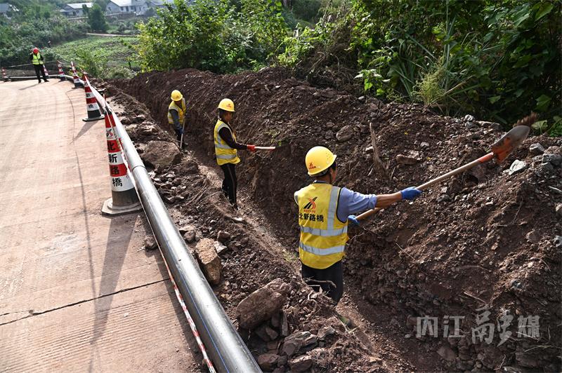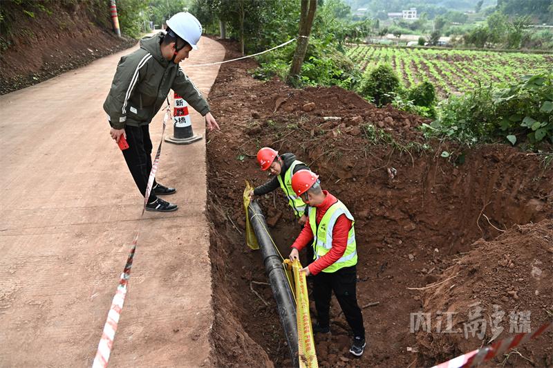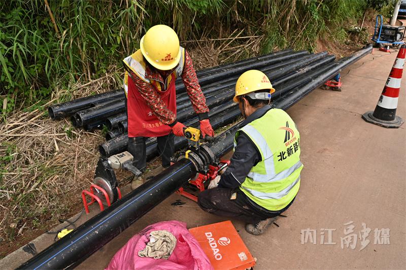 沙垫层夯实、管道热熔对接、管道沟槽清平、示踪线安装……11月20日上午,内江市东兴区高梁镇金龙村三组,施工单位抢抓晴好天气,克服复杂施工环境,有序铺设水管,乡村新建管网工程正稳步推进。