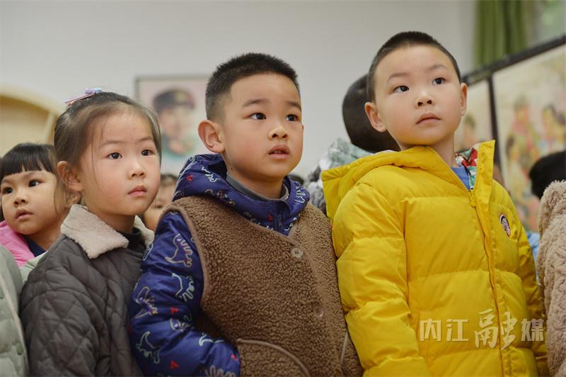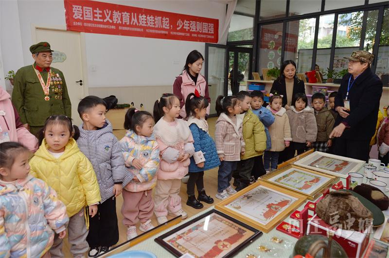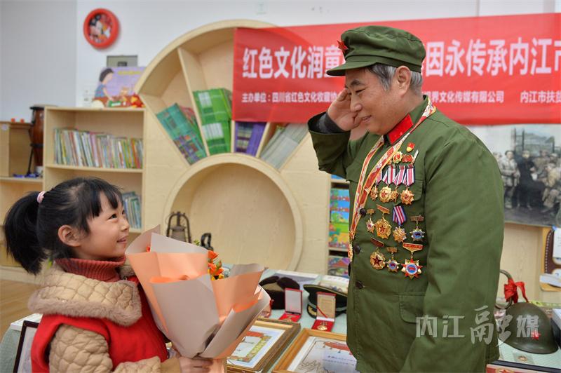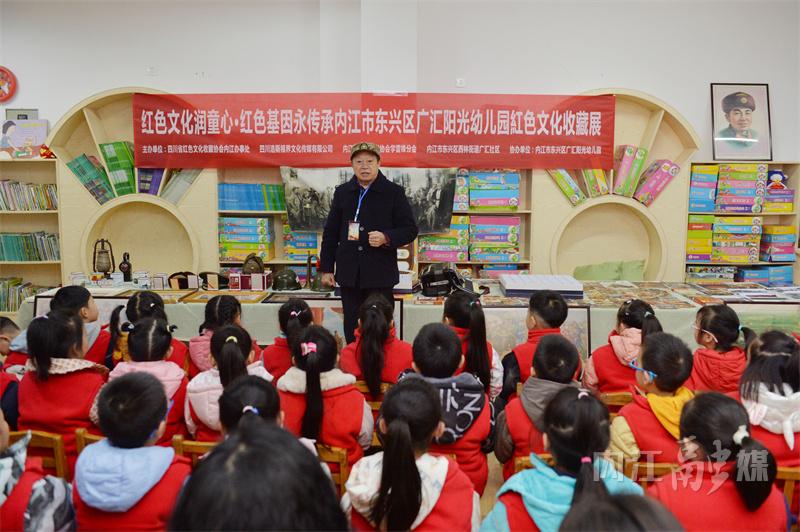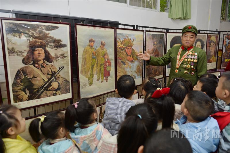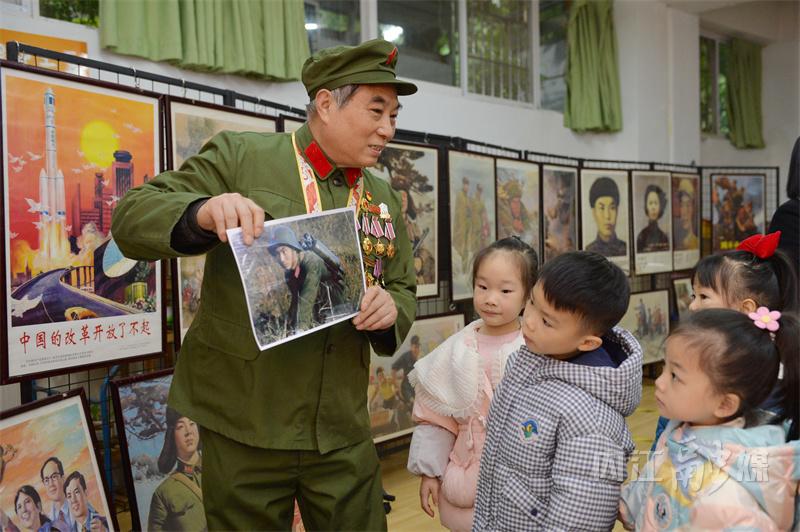 “爷爷,这些解放军叔叔是谁?”“这是雷锋叔叔,这是英雄邱少云,我给你们讲讲他们的故事……”11月26日下午,68岁的内江籍战斗英雄、一等功臣吴联邦指着一幅幅英雄模范人物的画像,向孩子们讲述他们的事迹。当天,“红色文化润童心•红色基因永传承——内江市东兴区广汇阳光幼儿园红色文化收藏展”在阳光幼儿园举行。