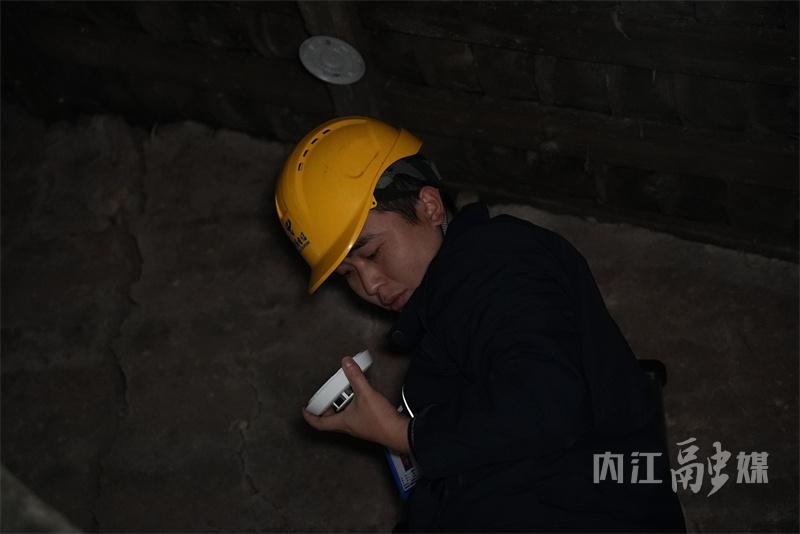 安装师傅曾伦和黄晓谦则迅速选好感烟报警器的安装位置,并拿出专业工具,对感烟报警器进行调试。