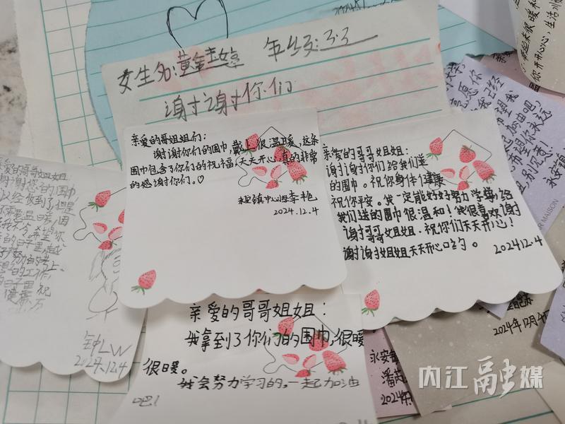 “谢谢哥哥姐姐们送的围巾,戴着很温暖。”“我一定会努力学习,一起加油吧!”……发放仪式上,学校老师在分发完围巾后,对全校学生进行了感恩教育,孩子们纷纷在贺卡上写下对哥哥姐姐们的感谢和祝福。