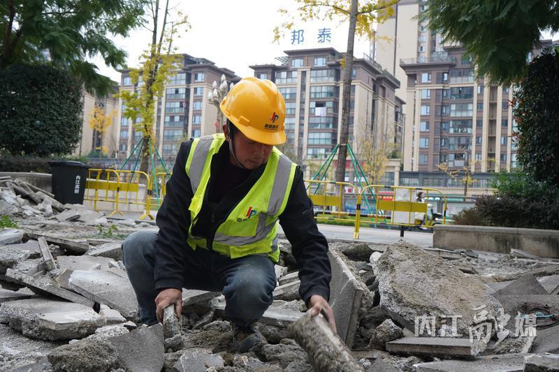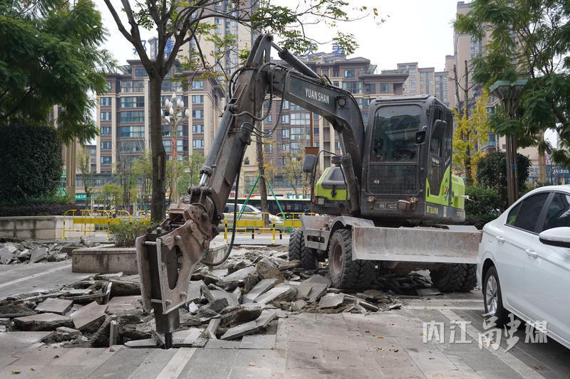 当天,记者来到汉安大道北侧东兴区甜都医院外的人行道看见,破碎机发出阵阵轰鸣声,正对地面已经损坏的花岗石进行拆除,工人则穿梭其中,将破除后的石块及时搬运清理。与此同时,在汉安大道南侧汇宇一品小区外的人行道,道路破除工作已经全部完成,工人正在有序清理原状基层路面。