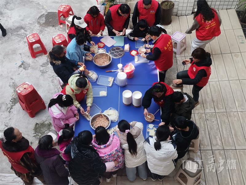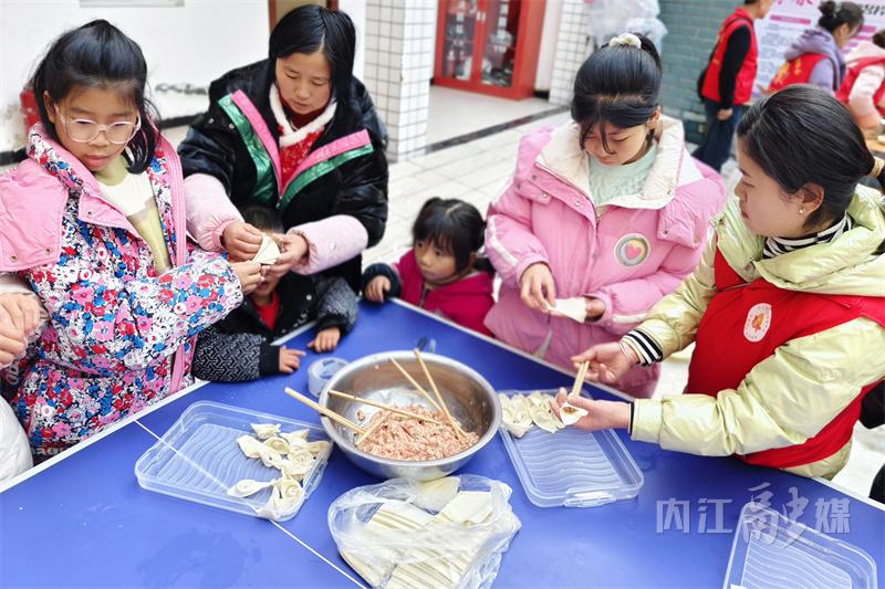 临近中午,志愿者带领学生们包抄手。志愿者们手把手教,学生们认真学。不一会儿,几百个抄手就包好了。经过志愿者的烹饪,大家围坐一起,娃娃们品尝着自己包的抄手,现场香气四溢。