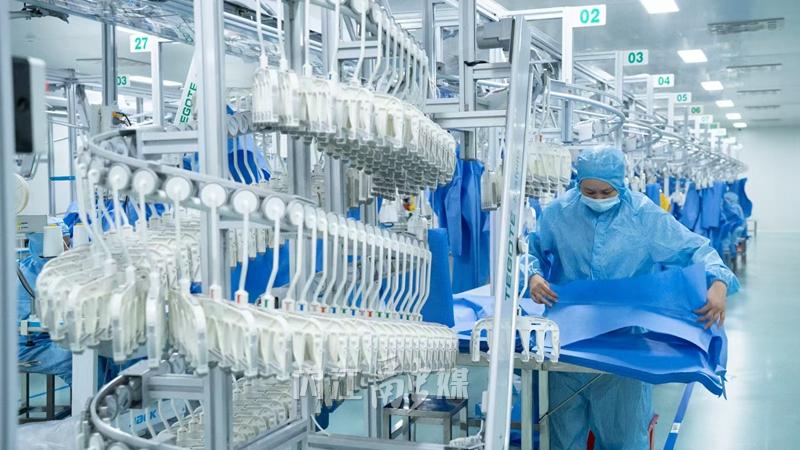 跟随刘君的脚步,记者走进了生产车间参观通道,多条自动化生产线快速高效运转,在机械手臂的快速转换中,棉签、口罩、手术单等医疗耗材源源不断“走”下流水线。