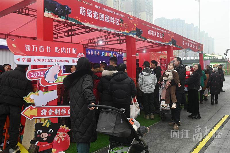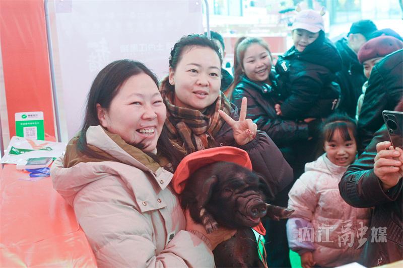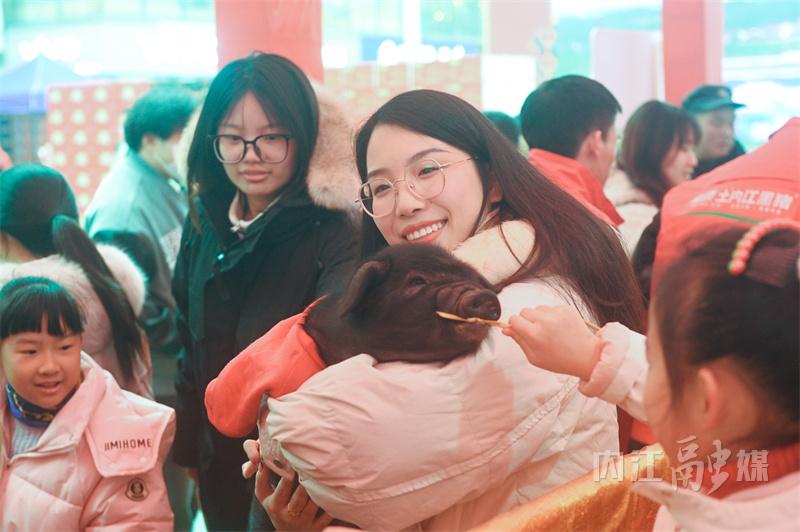 为了让市民们更加深入地了解内江黑猪和年猪文化,活动现场还设置了多个互动游戏区。其中,萌猪套圈游戏深受游客们的喜爱。游客们可以手持圆环,站在指定位置,向远处的萌猪投掷。如果圆环成功套中萌猪,就可以获得一份精美礼品。在年猪合影打卡区,游客们可以与戴着大红花的年猪合影留念,记录下难忘的瞬间,寓意来年运势旺旺旺。
