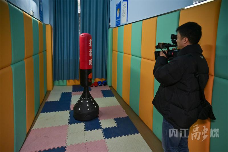 在隆昌二中,高三班级正在心理老师的引导下,通过分组绘画练习的方式进行心理团辅,同学们踊跃交流互动,课堂氛围轻松而有趣。同时,采访团记者走进学校“心理成长”工作坊,在心理咨询室、情绪宣泄室、沙盘室、音乐放松室等各功能区穿梭往来,一边听心理老师介绍一边记录要点、拍摄素材。