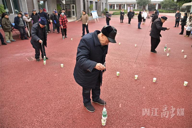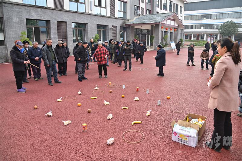 院坝里,老人们或三五成群锻炼身体,或排排坐聊天晒太阳,更多的老人则围在一起,参加每日都举办的趣味游戏,赢取香蕉、牙膏、毛巾、零食等小奖品,院坝里传来阵阵欢声笑语。