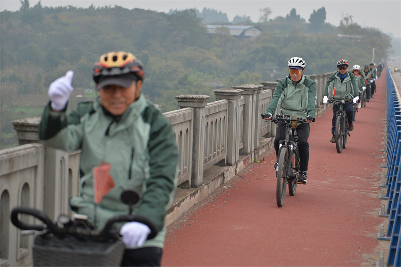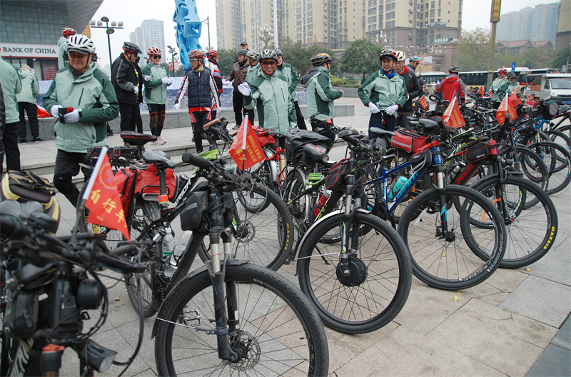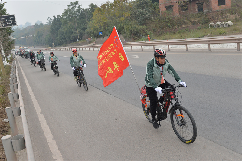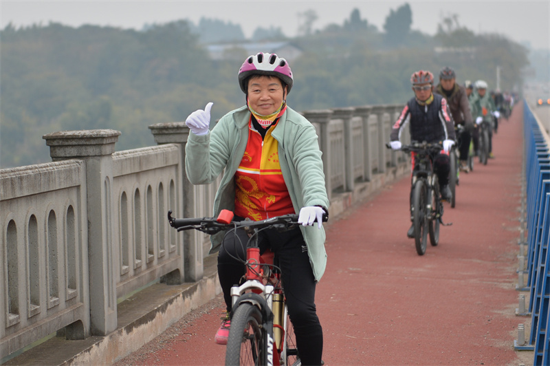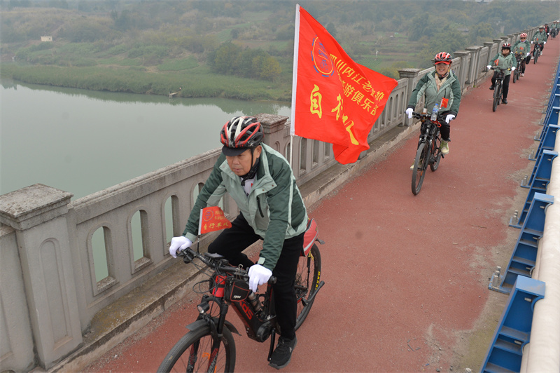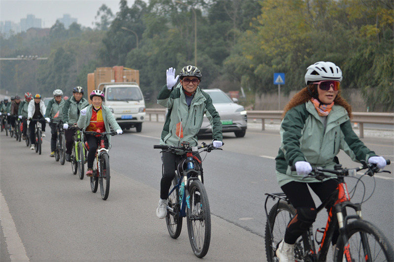 “出发!”12月25日,随着一声口令,内江市老年体协骑游俱乐部60多名队员骑上自行车,从万达广场出发,沿321国道向市中区史家镇方向行驶。