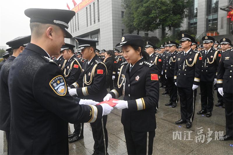活动中,最激动人心的是荣誉奖章授予仪式。内江市公安局东兴区分局首先为荣获表彰奖励的辅警代表颁发了荣誉证书,表彰他们在日常工作中的辛勤付出与卓越贡献;紧接着,为立功受奖的民警代表颁发了证书,特别是颁发了四川公安民警服务成就荣誉奖章,这是对他们在维护社会稳定、保障人民安宁中作出突出贡献的最高肯定。