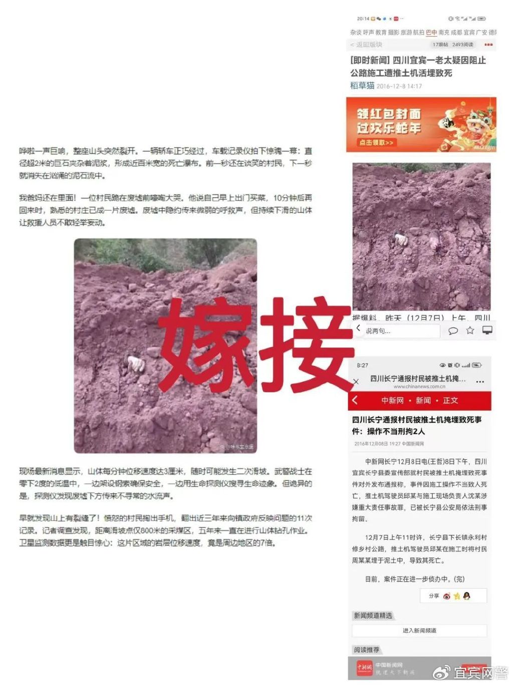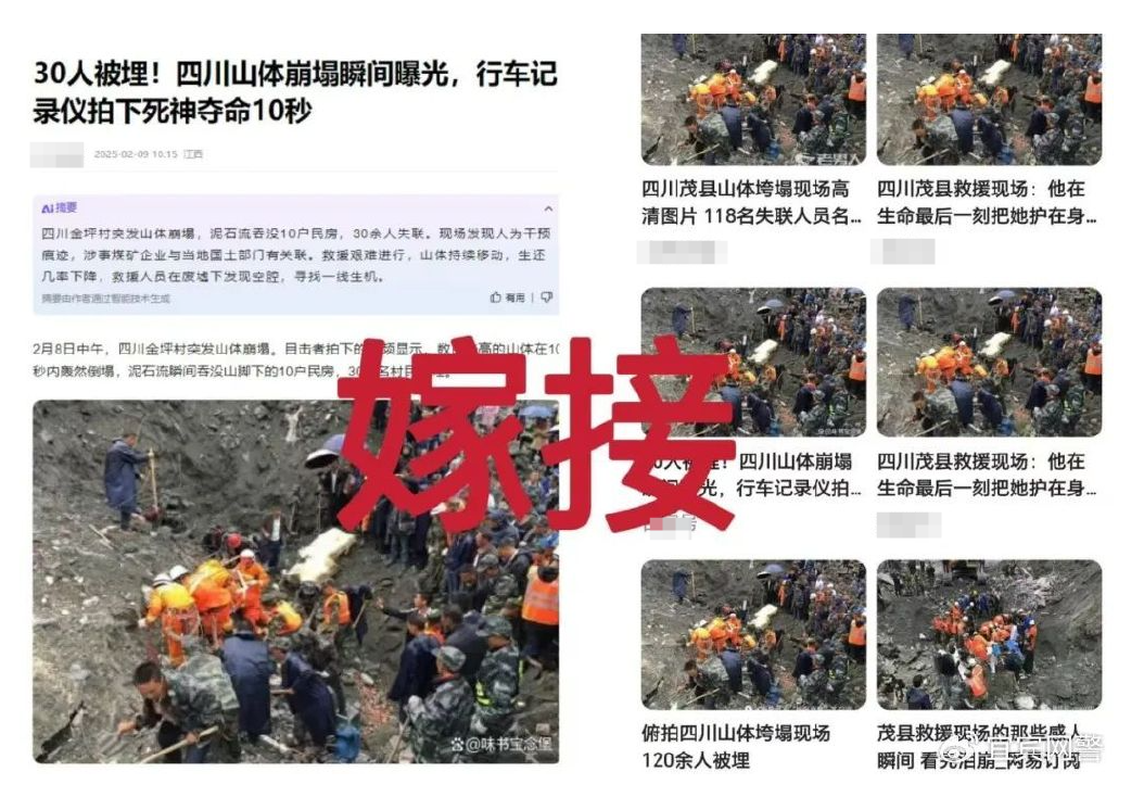 2月9日,有网民在某网络平台发布题《30人被埋!四川山体崩塌瞬间曝光,行车记录仪拍下死神夺命10秒》的贴文。经核实,贴文配图均为嫁接旧闻、图文翻炒,网民将2024年8月茂县山体滑坡救援现场、2016年12月宜宾市长宁县下长镇永利村一村民被推土机掩埋致死事件的旧闻重新拼接合成,编造为宜宾筠连山体滑坡最新动态后发布。