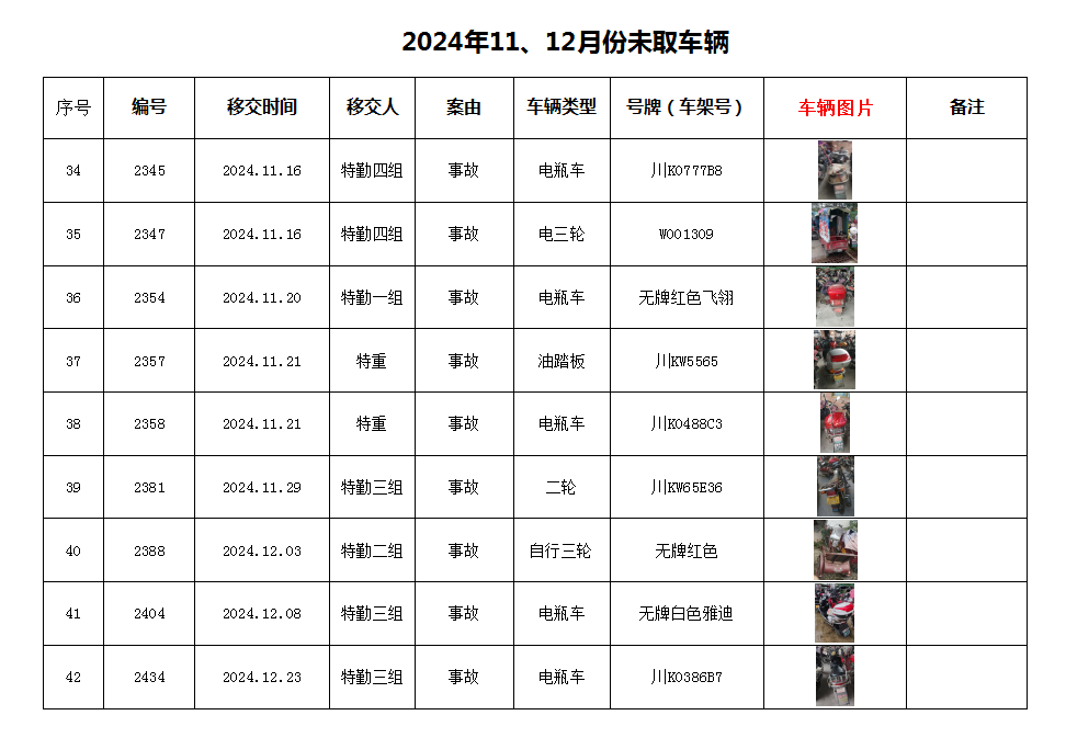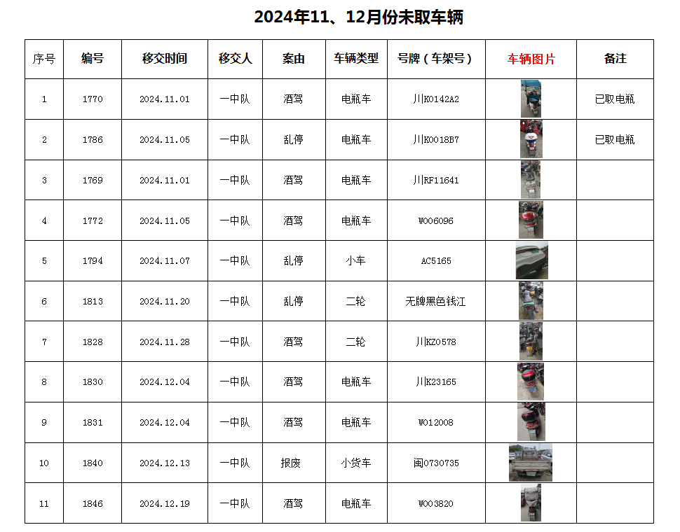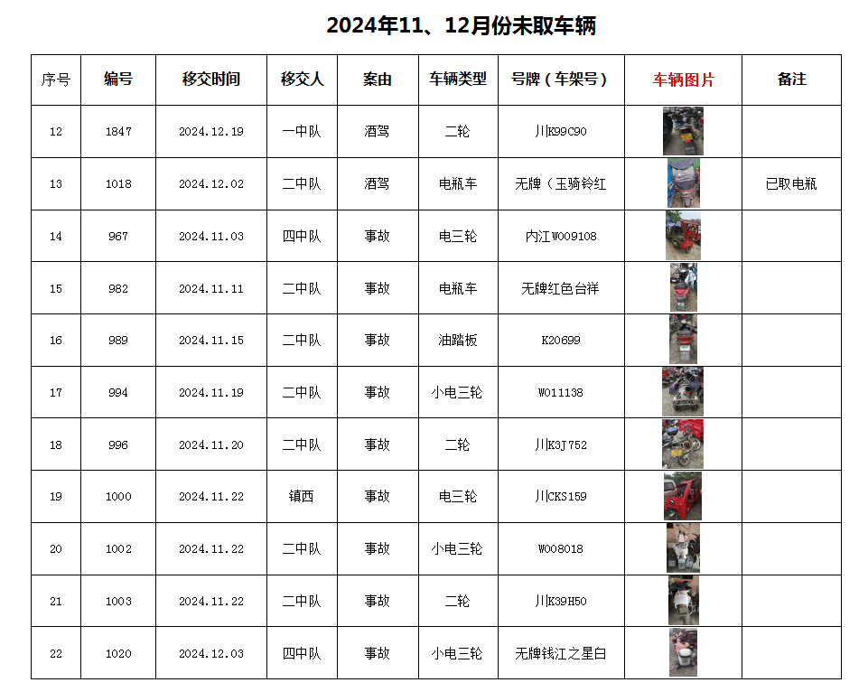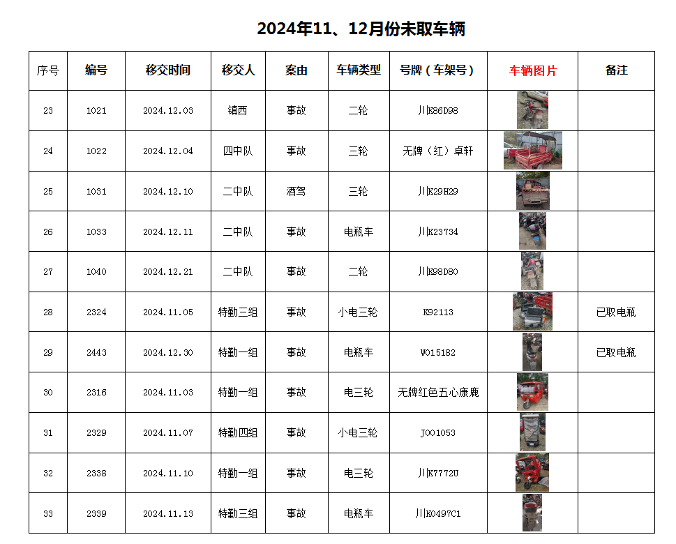 根据《中华人民共和国道路交通安全法实施条例》第一百零七条:“依照道路交通安全法第九十二条、第九十五条、第九十六条、第九十八条的规定被扣留的机动车,驾驶人或者所有人、管理人30日内没有提供被扣留机动车的合法证明,没有补办相应手续,或者不前来接受处理,经公安机关交通管理部门通知并且经公告3个月仍不前来接受处理的,由公安机关交通管理部门将该机动车送交有资格的拍卖机构拍卖,所有价款上缴国库;非法拼装的机动车予以拆除;达到报废标准的机动车予以报废;机动车涉及其他违法犯罪行为的,移交有关部门处理。”的规定,请以下车主(名单附后)于2025年05月17日前携带相关合法凭证到威远县公安局交警大队办理手续后领取车辆,逾期不来办理的,依照相关规定予以处理。