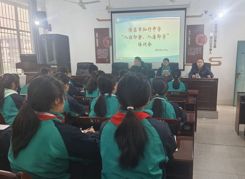 2月19日下午,隆昌市知行中学“入班即静,入座即学”2024年秋季学期表彰会暨2025年春季学期工作培训会举行。学校分管教育教学的副校长龚志刚、教科室主任杨忠泽、学生会主席团及纪律部成员、各班“入班即静,入座即学”管理员60余人参会。