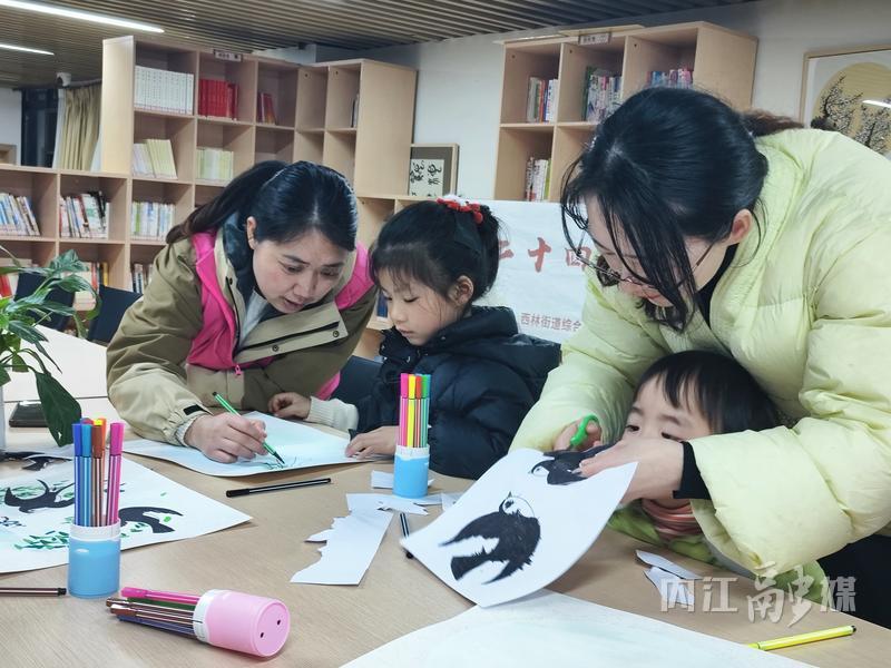 接着,在绘画课上,志愿者组织大家画小燕子,居民们先用纸精心剪出燕子造型,细心地为每只“燕子”点缀翅膀纹理,另一边,水彩绘制的垂柳枝条随风舒展,嫩绿的柳叶与淡褐的枝干相映成趣。随即,居民将一只只栩栩如生的“燕子”剪下并粘贴在画纸上,作品充满了童趣与生机。
