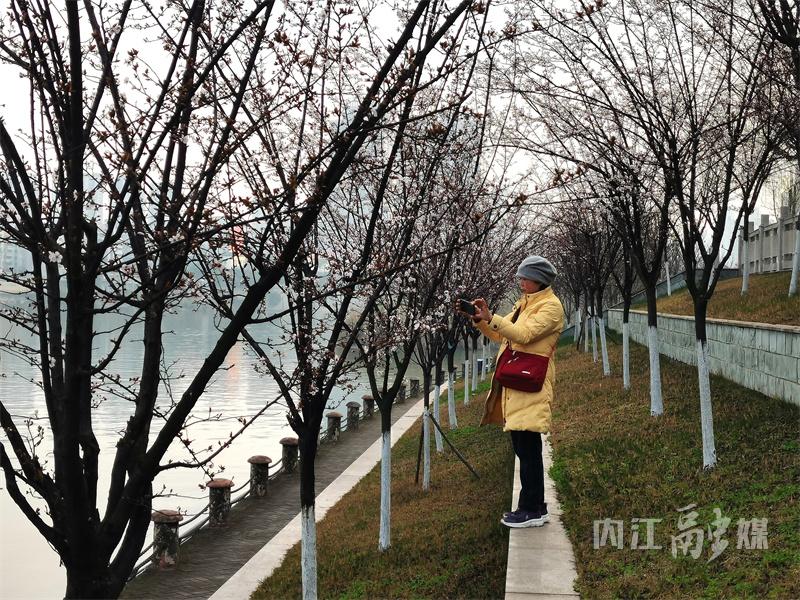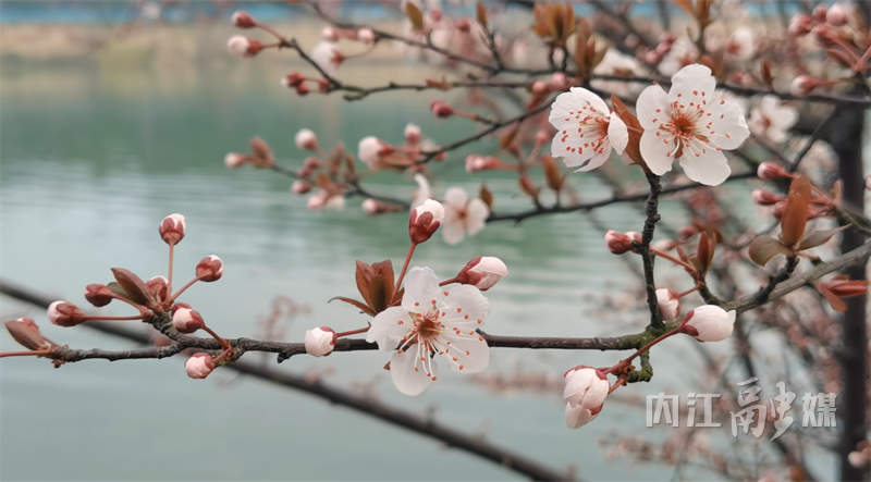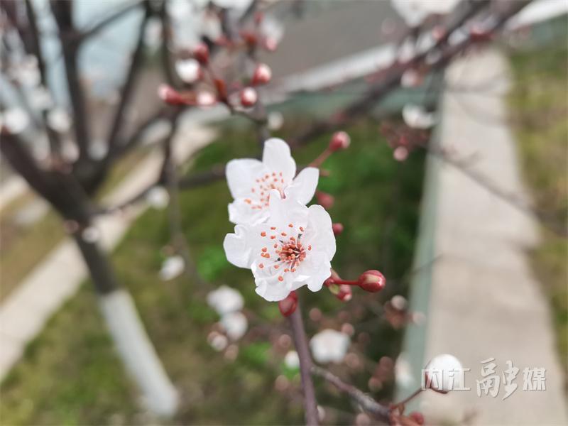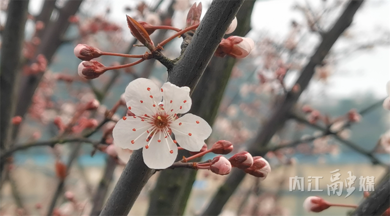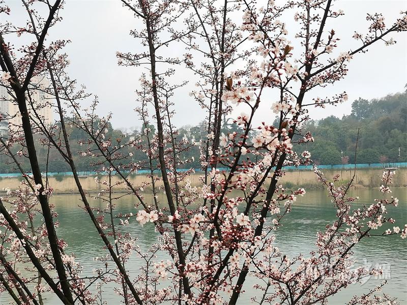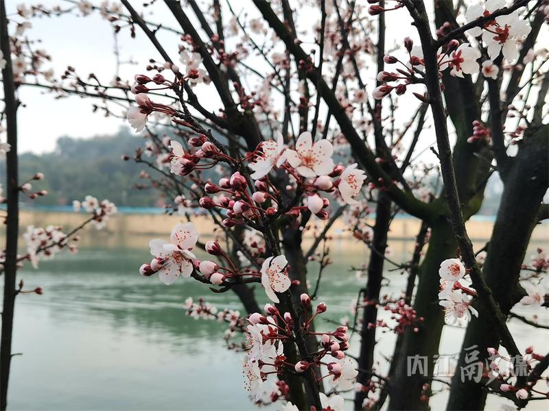 2月27日,记者在大洲广场的沱江河堤上看到,一排排紫叶李树的花朵正迎着春风绽放。走近细看,树枝上的叶子尚未完全舒展,嫩芽初露,但枝头已挂满了或含苞待放、或盛开的紫叶李花。