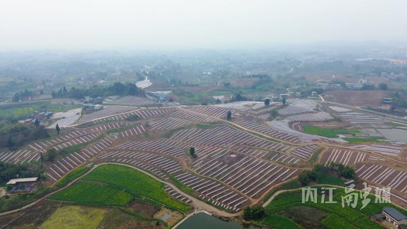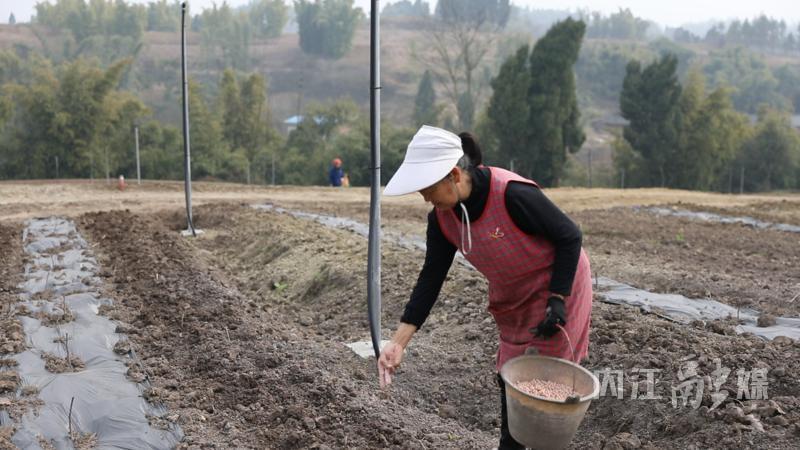 像这样的劳作场景,已经持续好几天了。肖体全介绍,脚下的这片正在备耕的土地有1300多亩,涉及威远县新店镇石子村和镇西镇核丰村两个村。白色地膜覆盖的是贝贝南瓜苗,黑膜覆盖的是无花果树,其间还有大豆新品种“川鲜豆7号”。