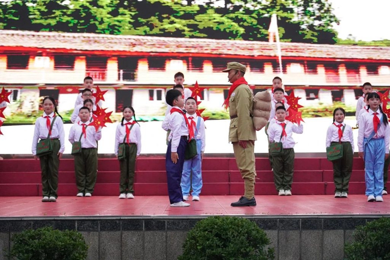 课本剧《“锋”向我往》以雷锋同志的成长经历为主线,讲述了雷锋从小被抗美援朝英雄故事深深感动,参军入伍,并将英雄黄继光作为榜样,誓言向其学习的故事。剧中,同学们用真挚的情感和生动的表演,再现了雷锋同志刻苦学习、乐于助人、无私奉献的感人事迹,展现了雷锋同志对党忠诚、热爱祖国、艰苦奋斗、无私奉献的崇高精神。