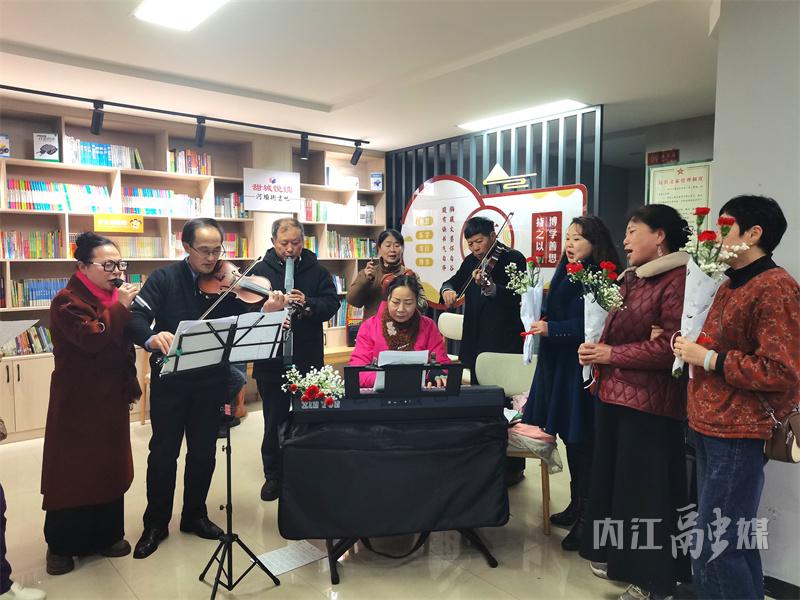 活动现场,妇女们围坐在三张大桌旁,桌上摆满了红色的康乃馨和洁白的满天星。大家拿起花朵、丝带、包装纸,自己设计和包扎花束,不时相互交流、帮助。河坝街社区的文艺志愿者们现场演奏动听的音乐,将现场氛围烘托得愈发温馨。