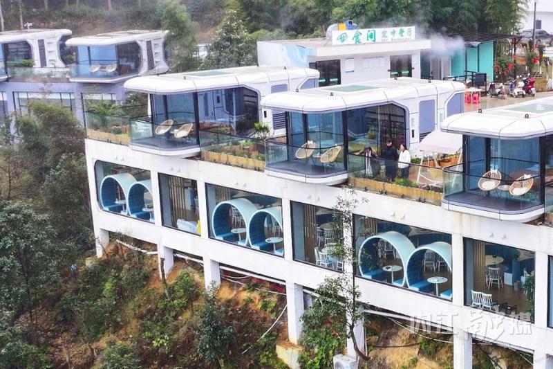 坐落在越溪镇龙洞村的东越天池特色民宿,依山势巧妙构建悬崖太空舱、云端空中餐厅等特色设施,让游客在尽享俩母山雄浑壮丽与东风水库宁静秀美的同时,沉浸于烧烤聚会、露营探险、徒步漫游等多元化休闲体验。
