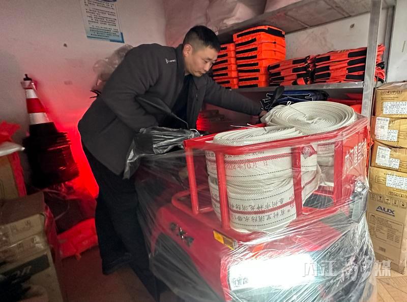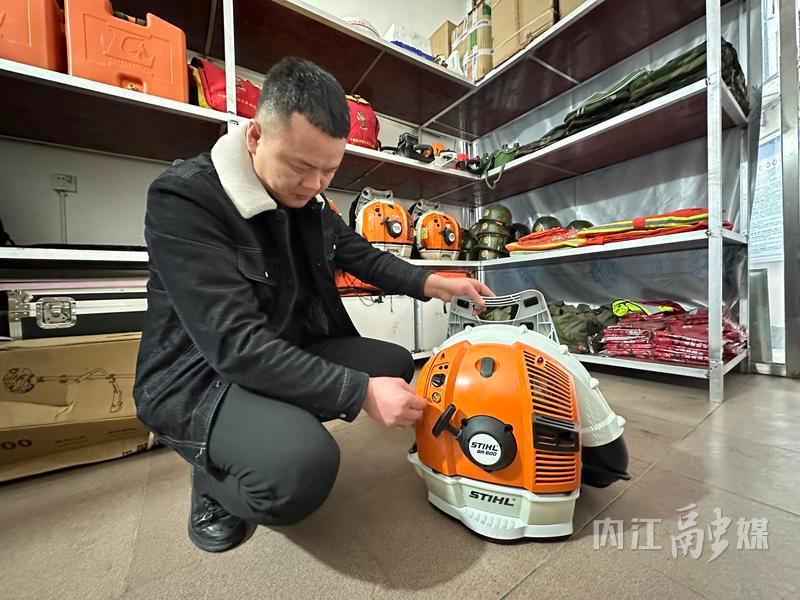 在响石镇森林防火应急物资仓库内,2020年加入扑火队的队员陈云章正在检查风力灭火机的运行状况。旁边的储物架上,整齐地摆放着防火服、高压水泵、手电筒等物资。