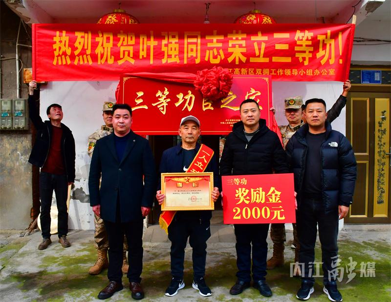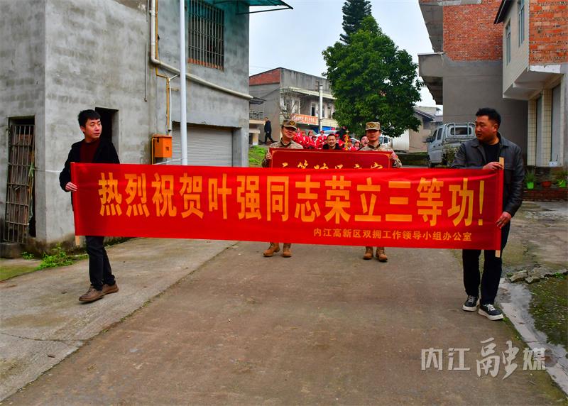 3月19日,内江的天空格外晴朗。在内江高新区胜利街道卢王场社区4组,现役军人叶强的家门外锣鼓喧天,热闹非凡。在围观群众的簇拥下,内江高新区社会事务局、区退役军人服务中心、内江高新区胜利街道人武部和胜利街道办事处的工作人员,将三等功喜报、功臣牌匾及奖励金送到了叶强家中。