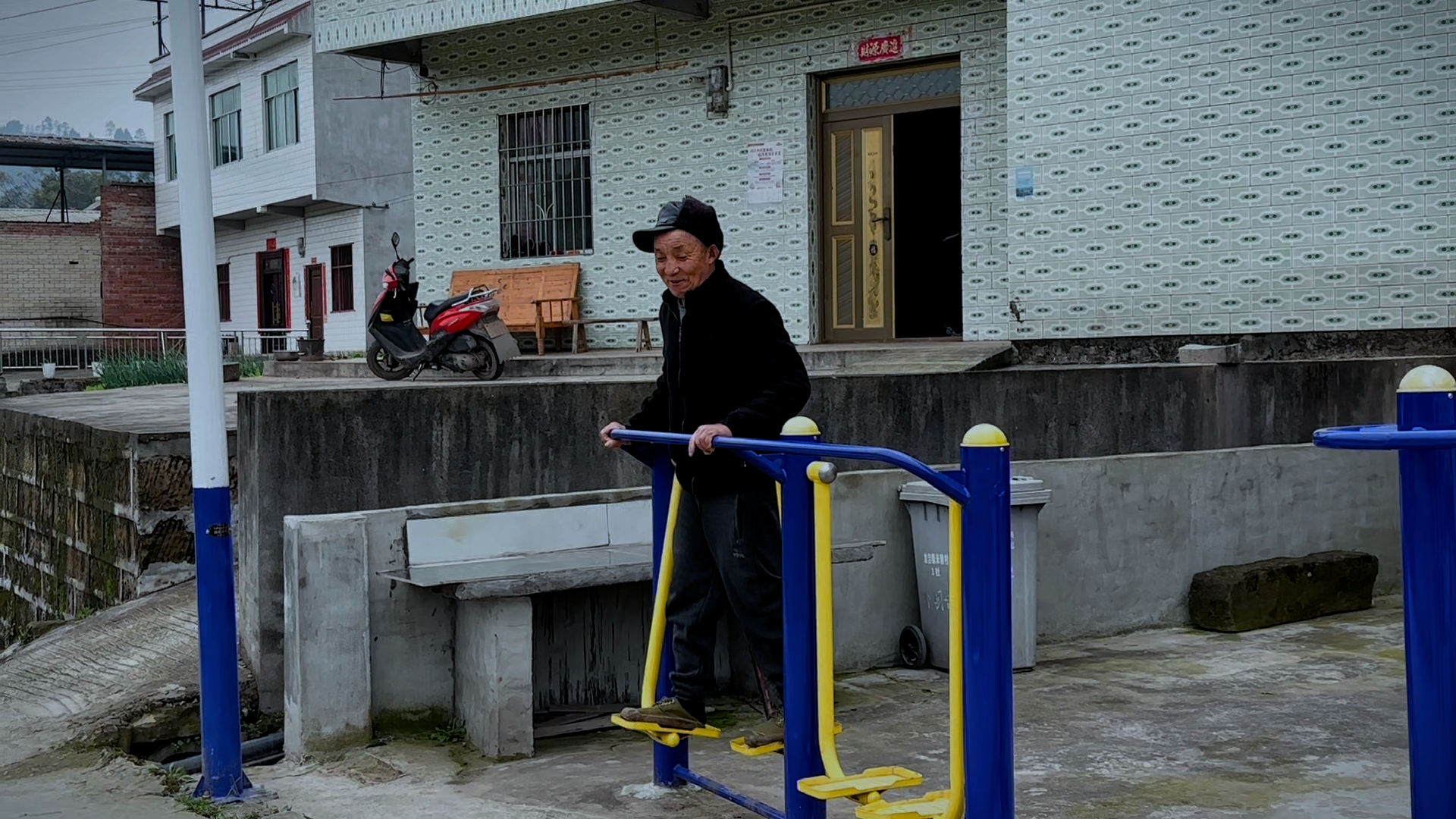 在林家大院,老人利用健身设施悠闲地锻炼身体,这成为乡村新貌的生动注脚。