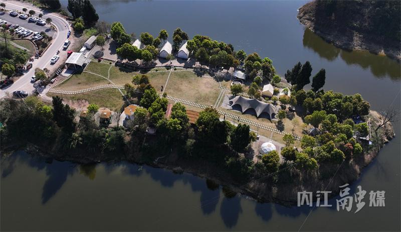 这一瓶颈在2023年迎来了转机。这一年,老寨子水库所在的明心寺镇入选全国首批“五好两宜”和美乡村试点,水库周边乡村风貌实现华丽蜕变。“我们科学规划,新(改)建道路约4公里、健身步道约1.9公里、登山步道约2.2公里,还建成1个长者食堂、2个生态广场、2个休憩驿站和1个农产品交易市场。同时,对老寨子水库7.7公里左右的水岸线生态环境进行整治,治理加固边坡1000余平方米,让乡村既有‘面子’又有‘里子’。”团市委书记、明心寺镇党委书记刘峻江介绍。