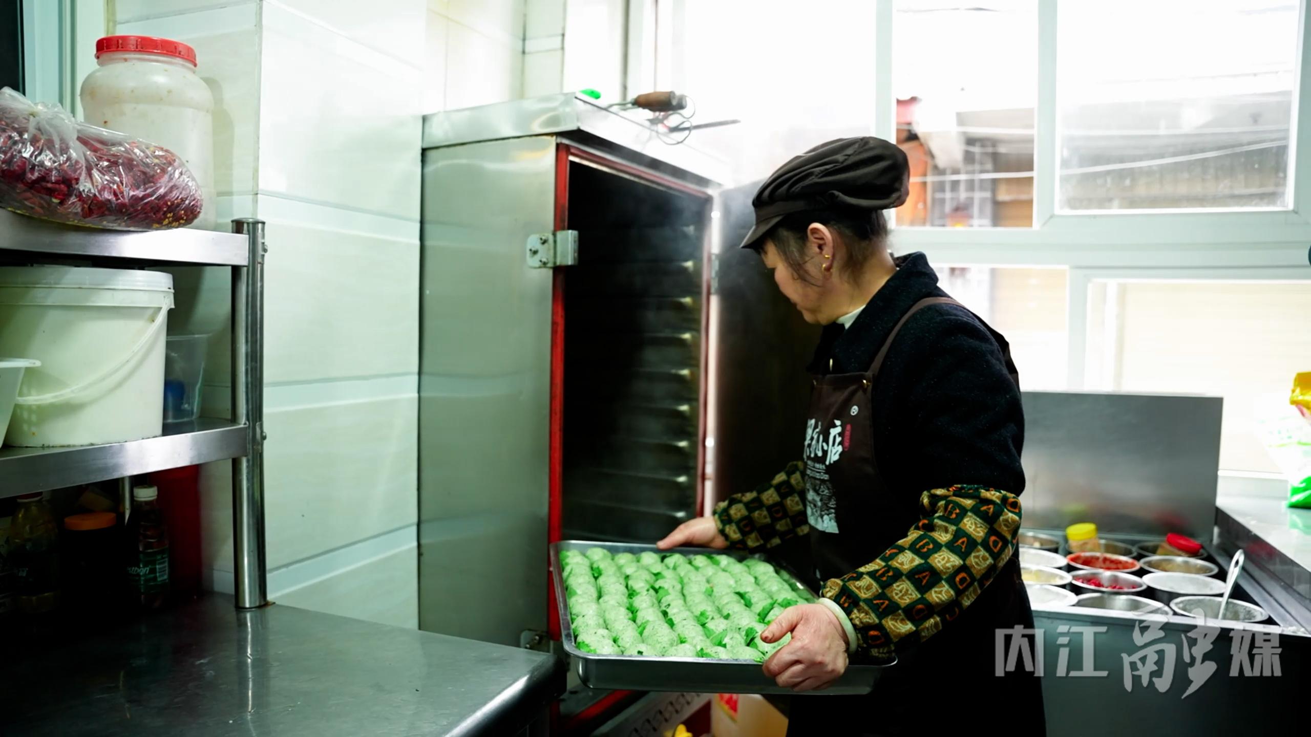 店员郑仕坤热情地为游客介绍猪儿粑的制作过程,她的后方就是厨房,灶上的火一直没歇,几大盆肉馅刚刚炒好,店员忙着将“艾草”(鼠曲草)放进盆里称重、捣出汁水。