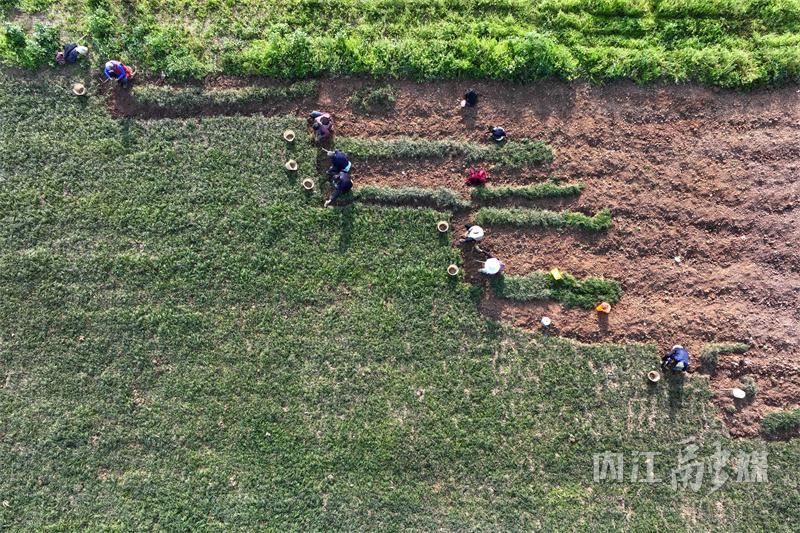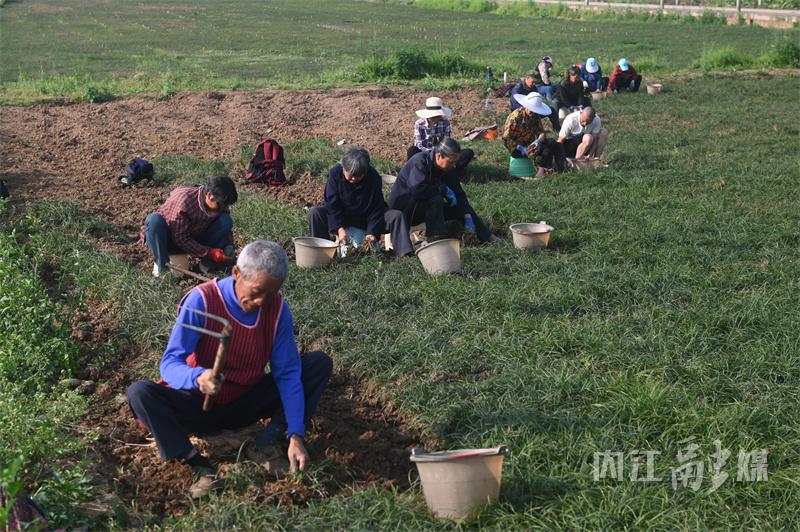 在明媚春光下,四美桥村的田野生机勃勃。村民们头戴草帽,熟练地挥动着工具,精心地将一株株麦冬从泥土里挖出。有的村民手持锄头,小心地刨开土壤,避免损伤麦冬的根系;有的则徒手轻轻拔起麦冬,抖落泥土后,整齐地放进篮子里,每个人的脸上都洋溢着丰收的喜悦。