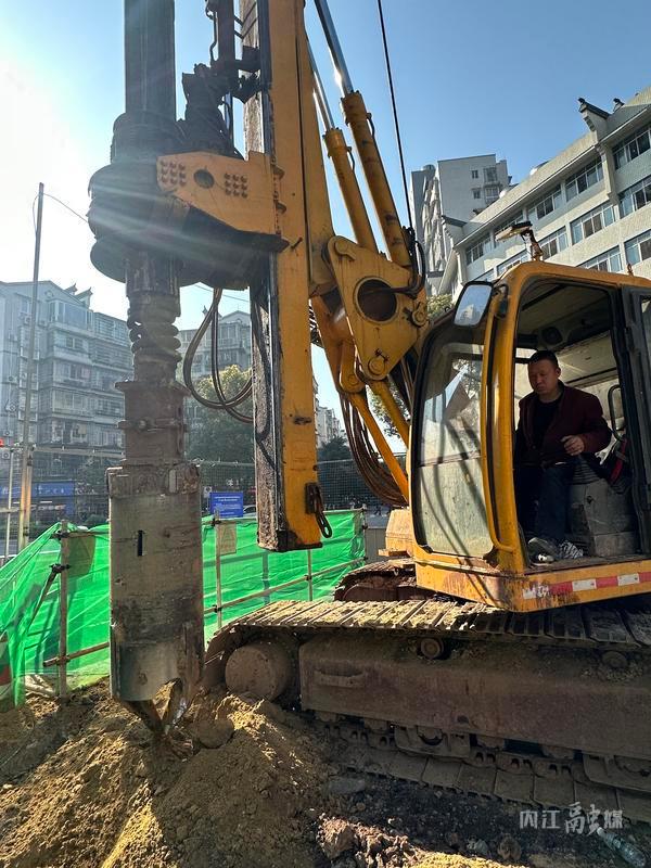 眼下,隆昌市大西街管道改造工程正在有序推进,只见灰色围栏将大西街部分路段分隔开来。围栏外,人来人往、车辆穿梭;围栏内,大型旋挖机正忙碌作业,钻头深入地底,发出“砰砰砰”声。片刻间,地面上便钻出了大小均匀、排列整齐的洞眼,届时将插入钢板桩,为后续的基坑挖凿工作做准备。头戴安全帽、身着衬衫的喻忠学,正叮嘱现场施工人员在确保安全的前提下,保证工程质量和进度。