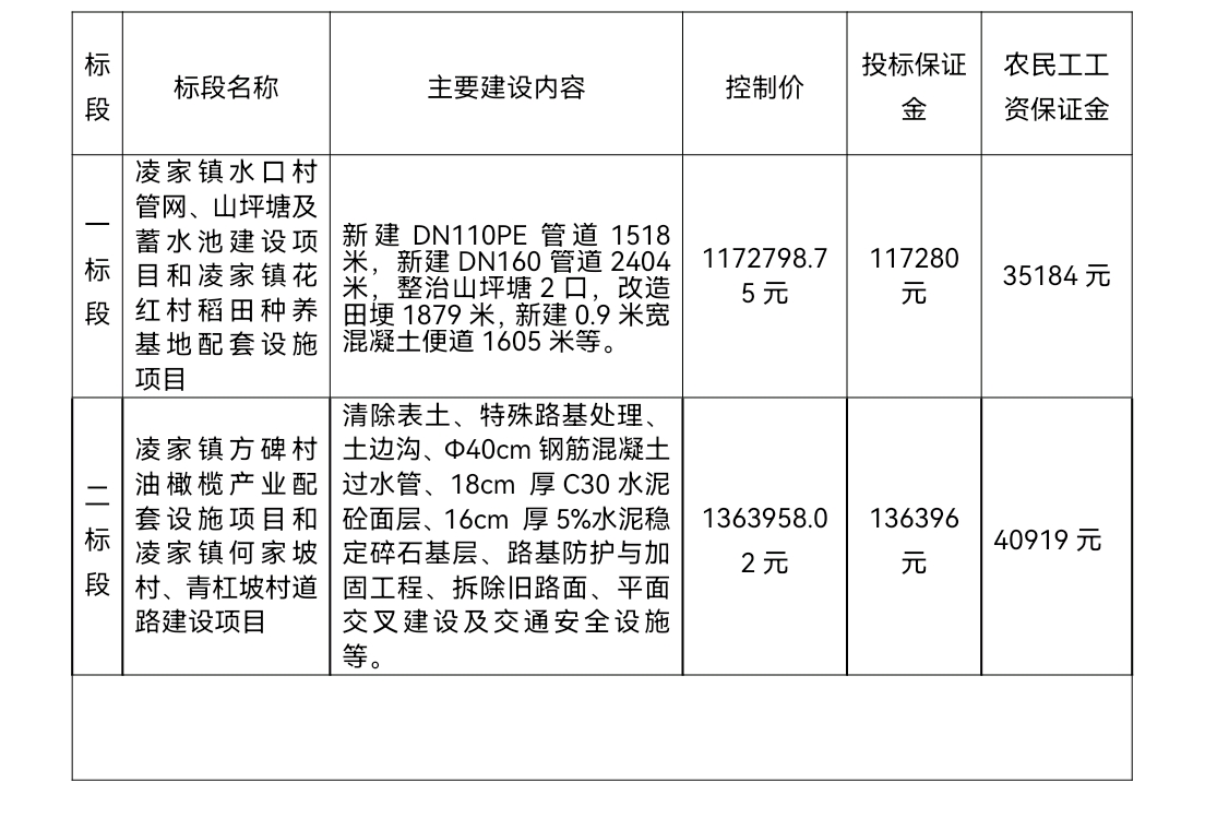 (一标段:凌家镇水口村管网、山坪塘及蓄水池建设项目和凌家镇花红村稻田种养基地配套设施项目。二标段:凌家镇方碑村油橄榄产业配套设施项目和凌家镇何家坡村、青杠坡村道路建设项目);