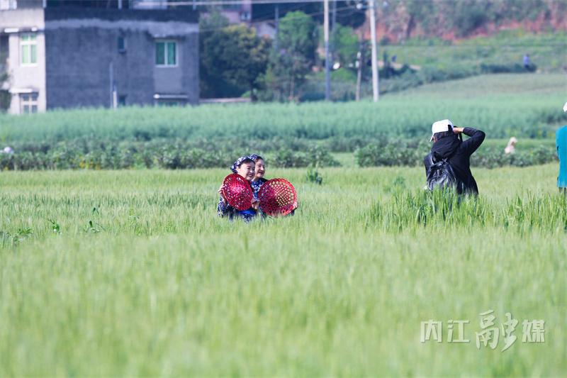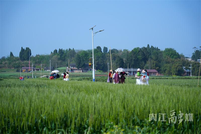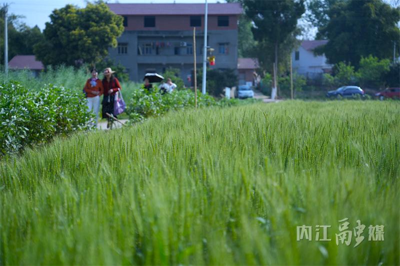 眼下,内江市东兴区田家镇火花村,一片绿意盎然的麦田景观仿佛宫崎骏动画里的场景,吸引了不少游客前往拍照打卡。