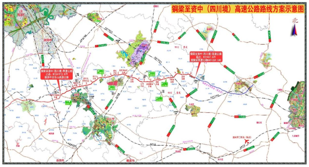 铜资高速项目路线起于内江市资中县,止于石羊镇川渝界处,接建成通车的铜梁至安岳高速公路重庆段,全长105公里。全线采用双向六车道高速公路标准建设,设计速度120公里/小时,总投资202亿元。