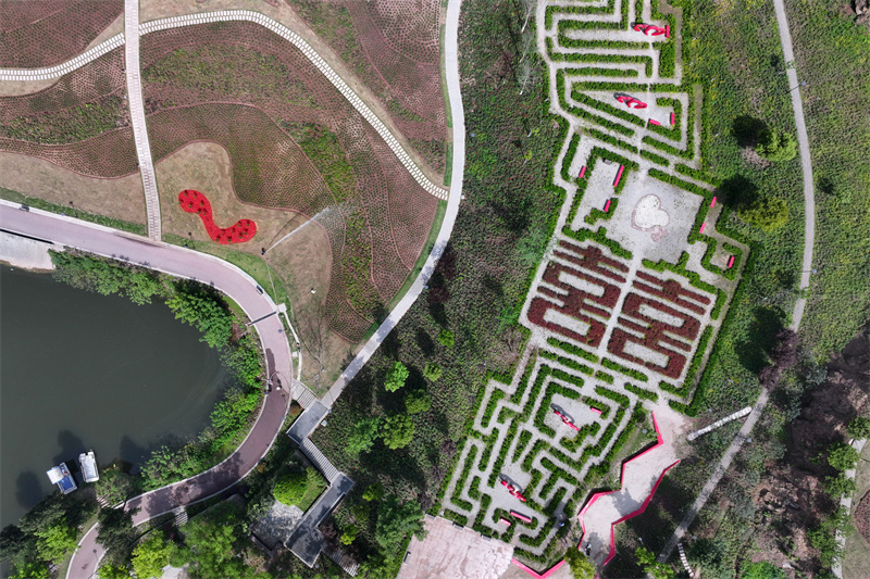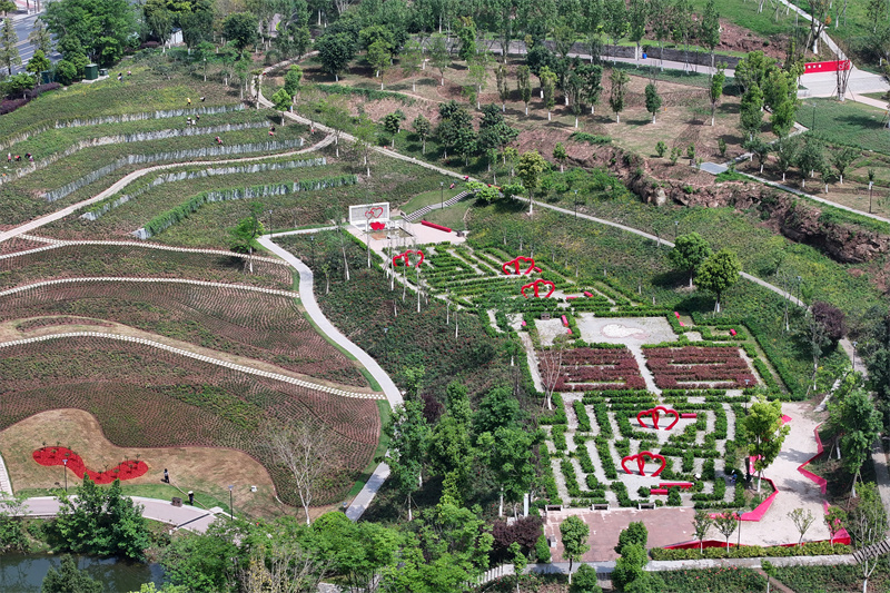 作为内江“甜蜜生活样板”的代表,五星湿地公园以“山水生态网、文化展示平台、甜蜜生活样板”为设计理念,将“甜城”“爱情”“家庭”等主题融入景观布局。位于西南侧的“花田喜事”功能片区尤为亮眼:特色浪漫花海、观赏月季园、爱情迷宫等景观串联起相遇广场、市民广场,林下活动空间与康体区域,为不同人群提供了休闲场所;糖果屋与爱情天梯等打卡点更是成为婚庆活动和拍照留念的热门地,让公园在发挥生态功能的作用下,更成为承载甜蜜记忆的文化载体。