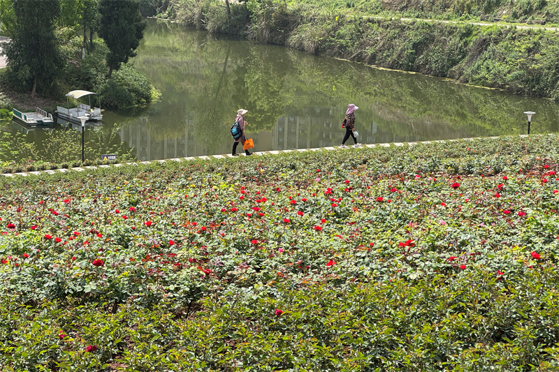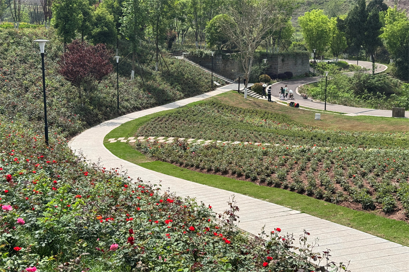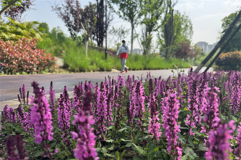 走进公园,蓝紫色的鼠尾草随风摇曳,纤长优雅;各色月季花争奇斗艳,红的热烈、粉的温柔、黄的明媚,与绿地、步道相映成趣。“我家就住在附近,退休后常和朋友过来散步,空气清新、环境舒适,特别安逸。”市民杨玲的话语道出了许多人的感受,不少游客或漫步花径,或驻足拍照,在花香与绿意中享受春日时光。