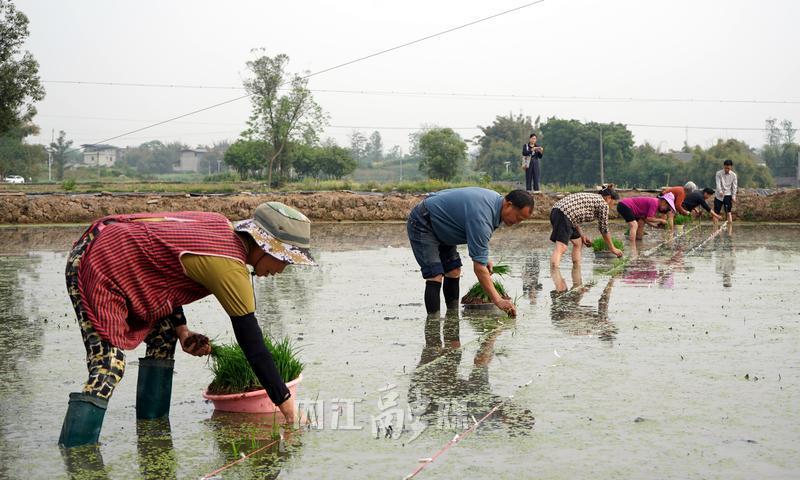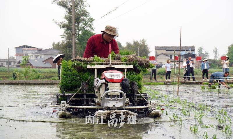 活动中,农技专家深入田间指导栽种技术,强调秧苗密度与深度管控;参加活动的人员现场观摩插秧机和植保无人机作业,展现科技兴农实效。