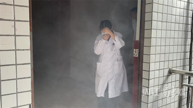 随着模拟烟雾在医院内迅速弥漫,刺耳的警报声骤然响起,各科室医护人员立即进入“战斗”状态。他们一边大声呼喊,安抚惊慌的“患者”,一边按照培训所学,弯腰低姿、捂住口鼻,沿着既定疏散路线,有条不紊地引导“患者”向医院外空旷地带转移。