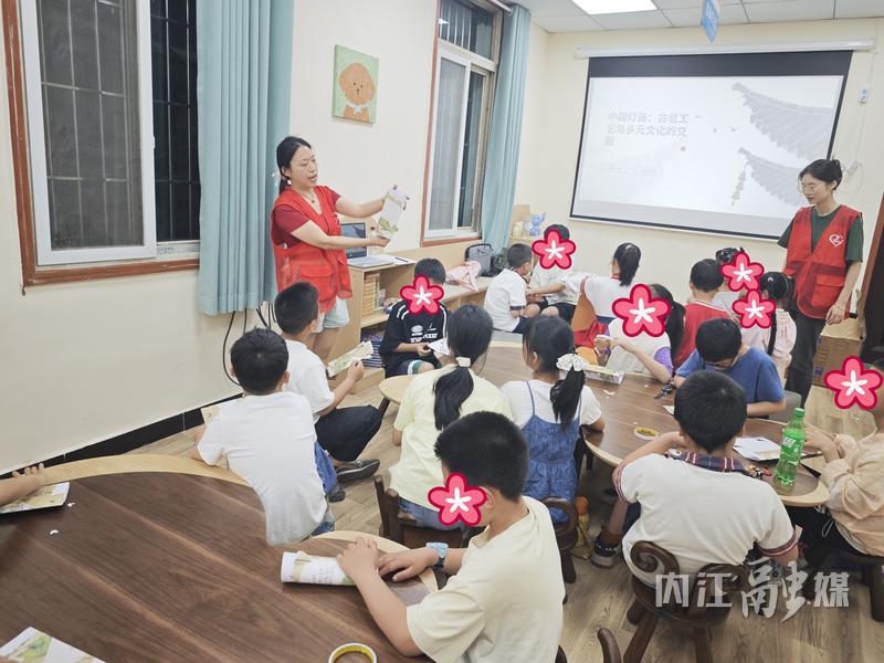 当天,志愿者带领孩子们一起学习中国提灯的起源、种类、造型等内容。