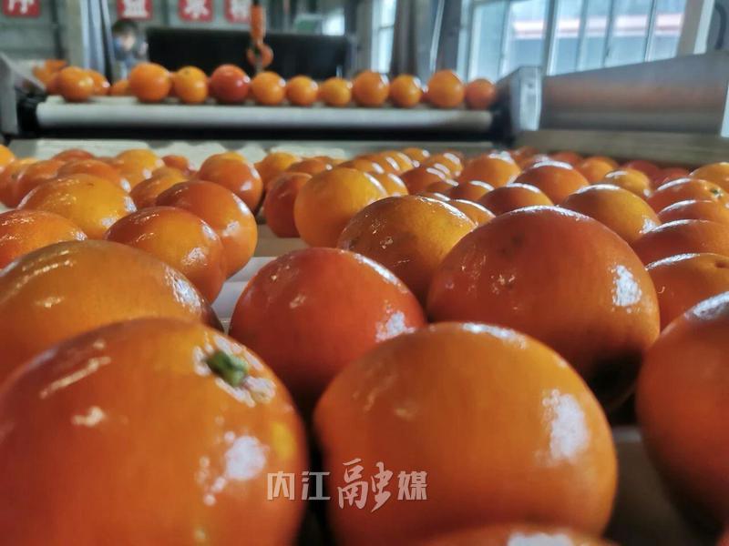 在资中县银山镇万亩血橙基地车间内,传送带不停运转,几十名工人正在生产线上忙碌着,一个个金灿灿的血橙快速通过智能检测仪。糖度达到14.2%、花青素含量58毫克/1000毫升的血橙,被称为“优果”。日前,一批500公斤的血橙“优果”经内江海关检验合格后发往泰国。