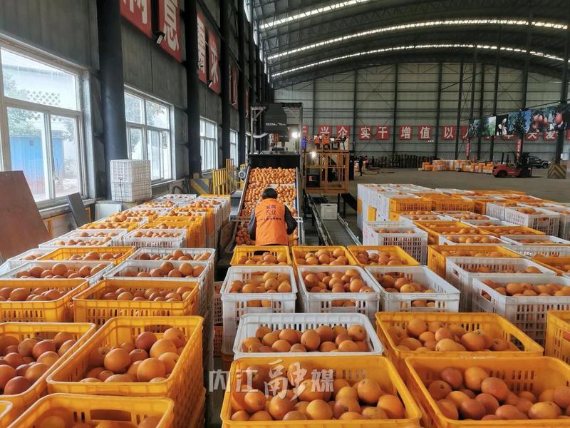 在资中县双河镇的资中血橙智能分选中心,是一片热火朝天的生产景象,机械设备开足马力加速运转,工人们在各自岗位上各司其职。据相关负责人介绍,通过低温诱导技术,这里出产的血橙果肉呈现独特的深血色,花青素含量提升5倍,维生素C含量达到普通柑橘的3倍以上。