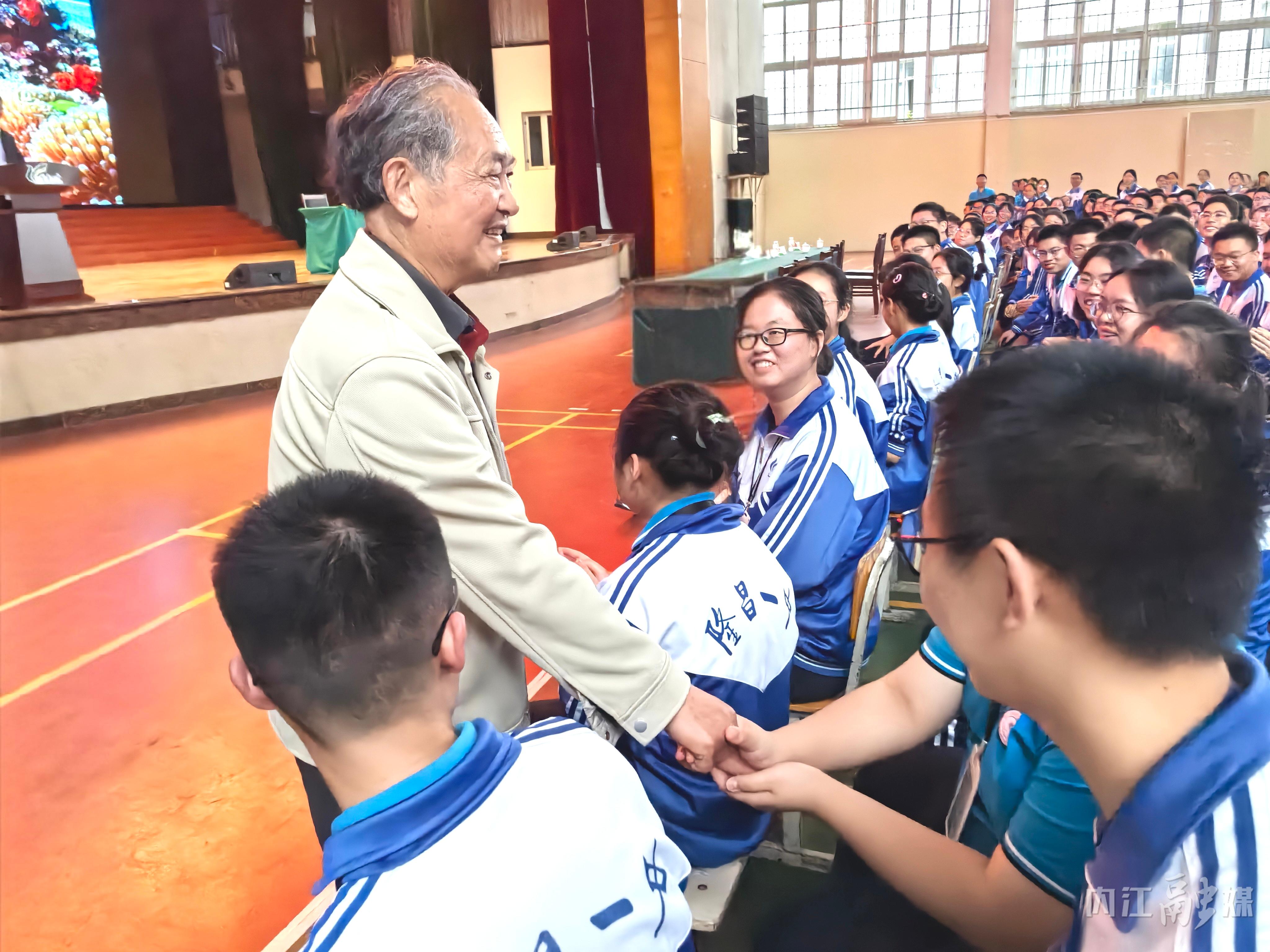 讲座结束,马远良走下讲台与学生握手,并殷殷寄语:“你们要好好学习,传承一中精神,勇攀科学高峰,为国铸剑,报效祖国。”