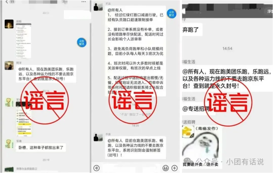 近日,有多个包含“美团封杀骑手去某平台跑单”“不要去跑某平台,查到就是永久封号”等内容的聊天截图在社交平台上广泛传播,引起社会各界关注。4月19日,美团发布声明:网传的聊天截图均为谣言,已固定证据并通过法律手段维权。